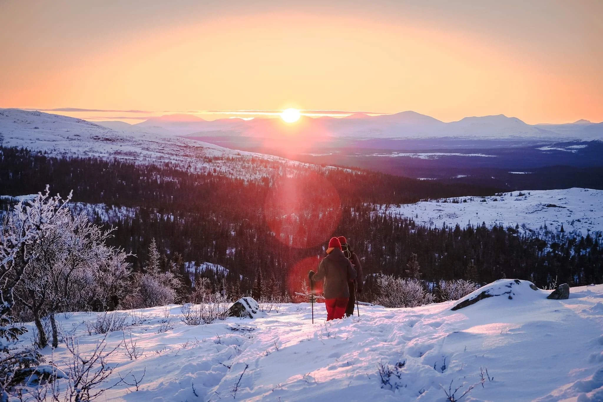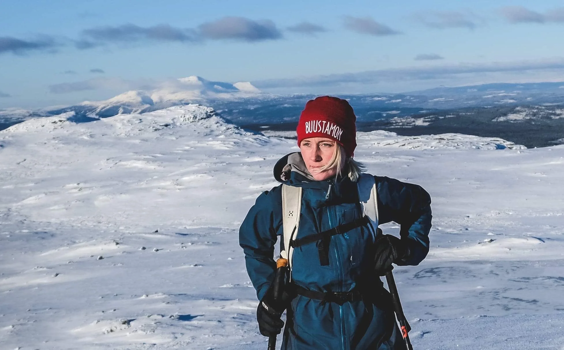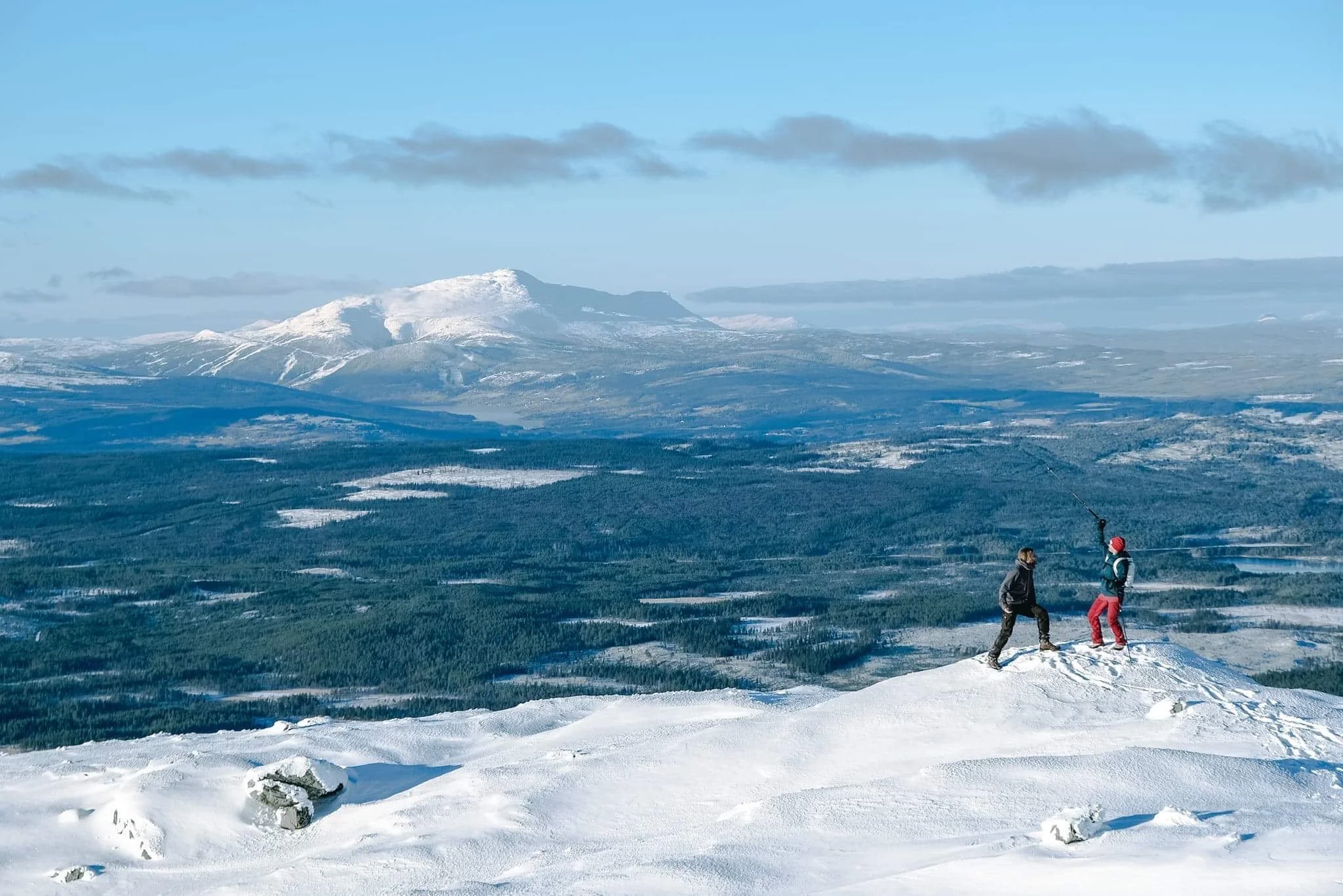 Ytterst tar du på eller med vindtäta kläder som du enkelt kan få bra ventilation i när du blir varm i en uppförsbacke. Luva på jackan kommer du vilja ha när vinden överraskar över krönet. När det är dags för fika eller turen börjar gå nedför är det en bra idé att svepa en varmare jacka om sig. Det finns bra jackor som går att komprimera i en påse så den inte tar så stor plats i packningen.